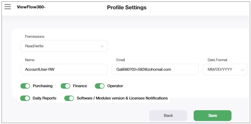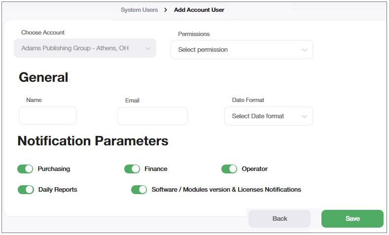 If you want this user to receive reports, set the Purchasing, Finance, Operator, Daily Reports, and Software / Modules version & Licenses Notifications buttons to ON (