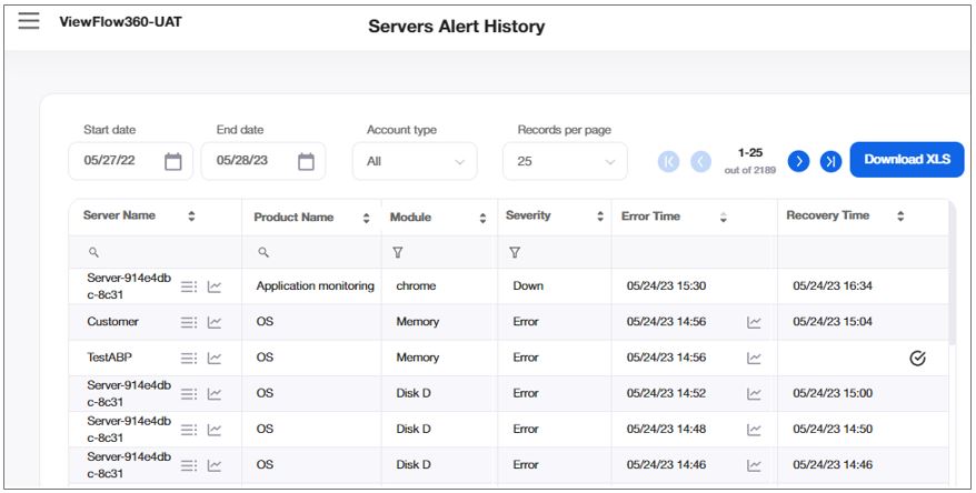View the alert history of all your servers in the time interval you define between the Start Date and the End Date.