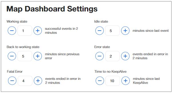 Each account (Coretex system) has a status representation on the Map Dashboard. Their status can be Working, Idle, Error, Fatal Error, and so on. In this section you must set the criteria according to which a Coretex system is in one state or another.