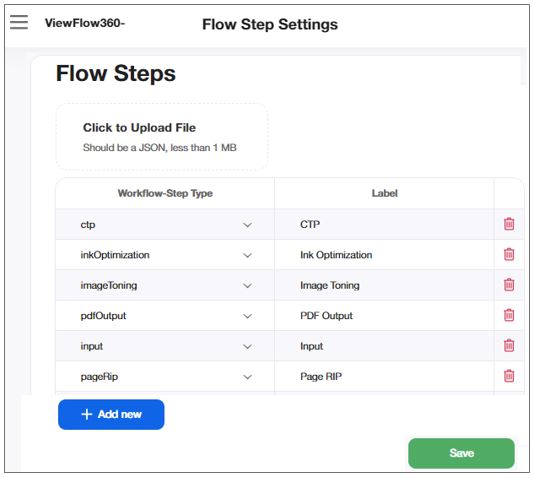 You can add them one by one by preparing a JSON file which contains all the flow steps and then load it into the server by using the Choose file button near the Load setup file field.