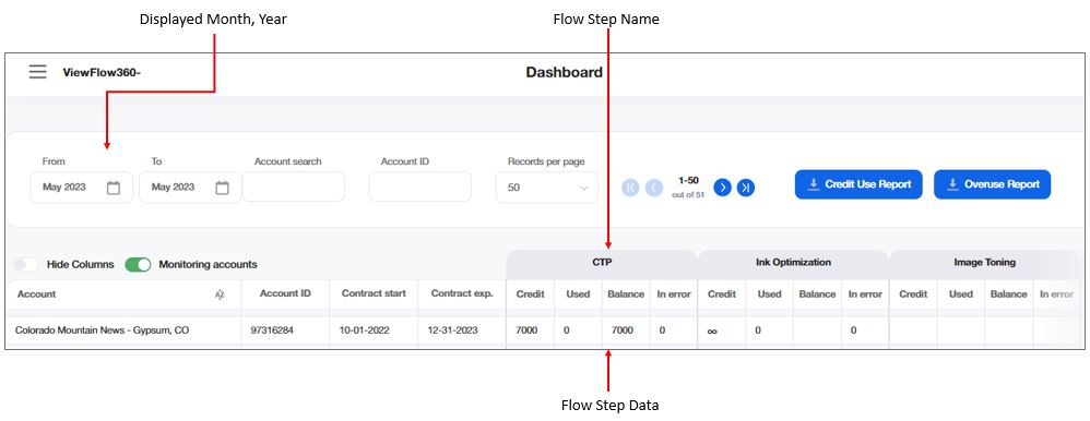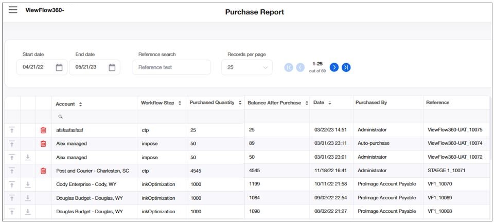 The purchase report displays the history of the credit purchases of all the accounts, per account and per flowstep.
