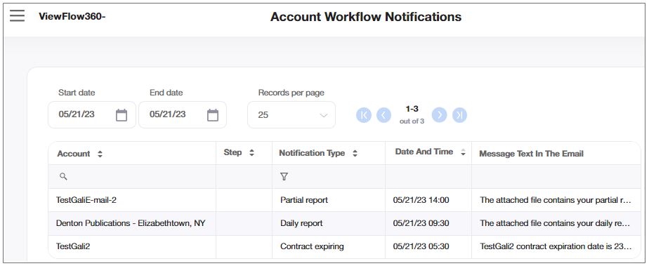 The account workflow notifications report sums up all the notifications regarding the workflow which VF360 sent to all the accounts by email within the time period between Start Date and End Date.