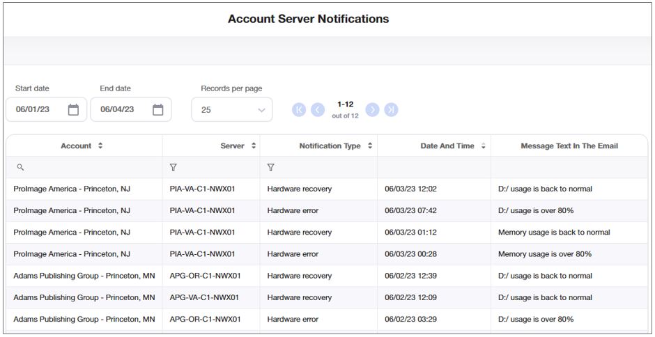The account server notifications report sums up the history of all the notifications regarding the servers, which VF360 sent to all the accounts by email within the time period between Start Date and End Date.