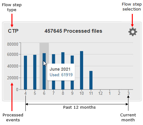 The Processed files in the system (past 12 months) parameter displays the number of events processed by all the monitored flow steps of all the accounts within the past 12 months, going back from the current date.