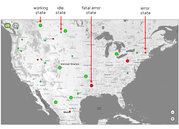 The map displays the location and the status of your accounts, as transmitted by the Coretex StatusReportAdapter of each monitored flow step of each account.