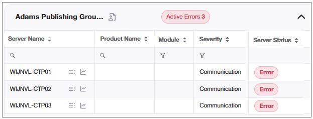 Each row in the table represents a account, for which you can see the name and the number of servers with active errors. For example, 3 active errors means there are three servers with active errors.