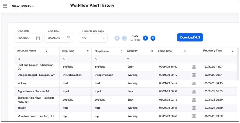 Use this alert view to monitor the history of all account's workflow errors for the period of time between the Start Date and the End Date.