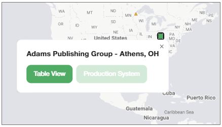 From the Map Dashboard view, select a account's icon to navigate to its Table View, to its Production System, to its Server Table (the server's alert history), its Workflow Table (the workflow's alert history), and so on. The navigation target depends on the account's state.